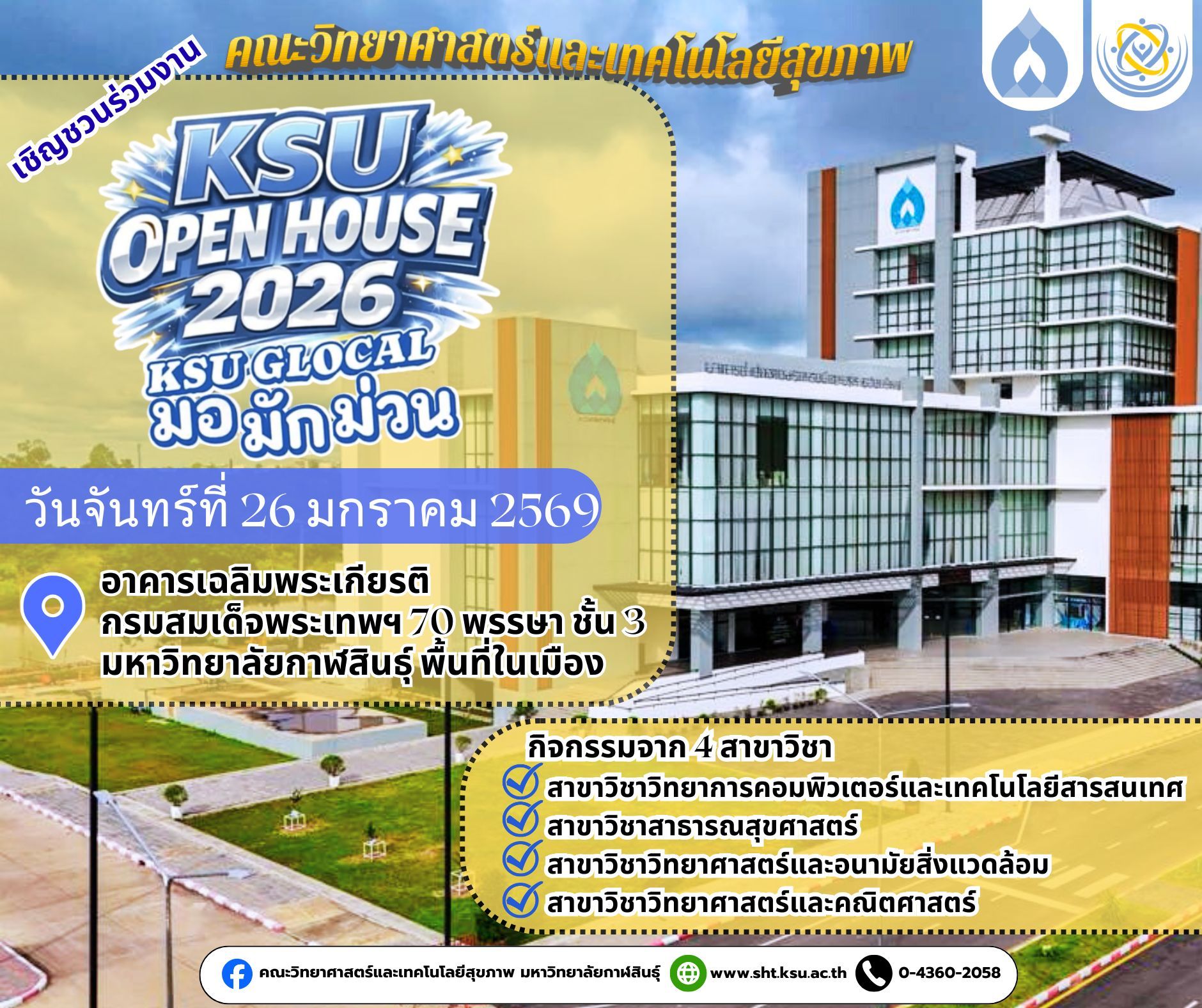 บรรยากาศการกล่าวต้อนรับ และแนะนำ คณะวิทยาศาสตร์และเทคโนโลยีสุขภาพ มหาวิทยาลัยกาฬสินธุ์ ในงาน Open house 2026 KSU GLOCAL “มอมักม่วน”
