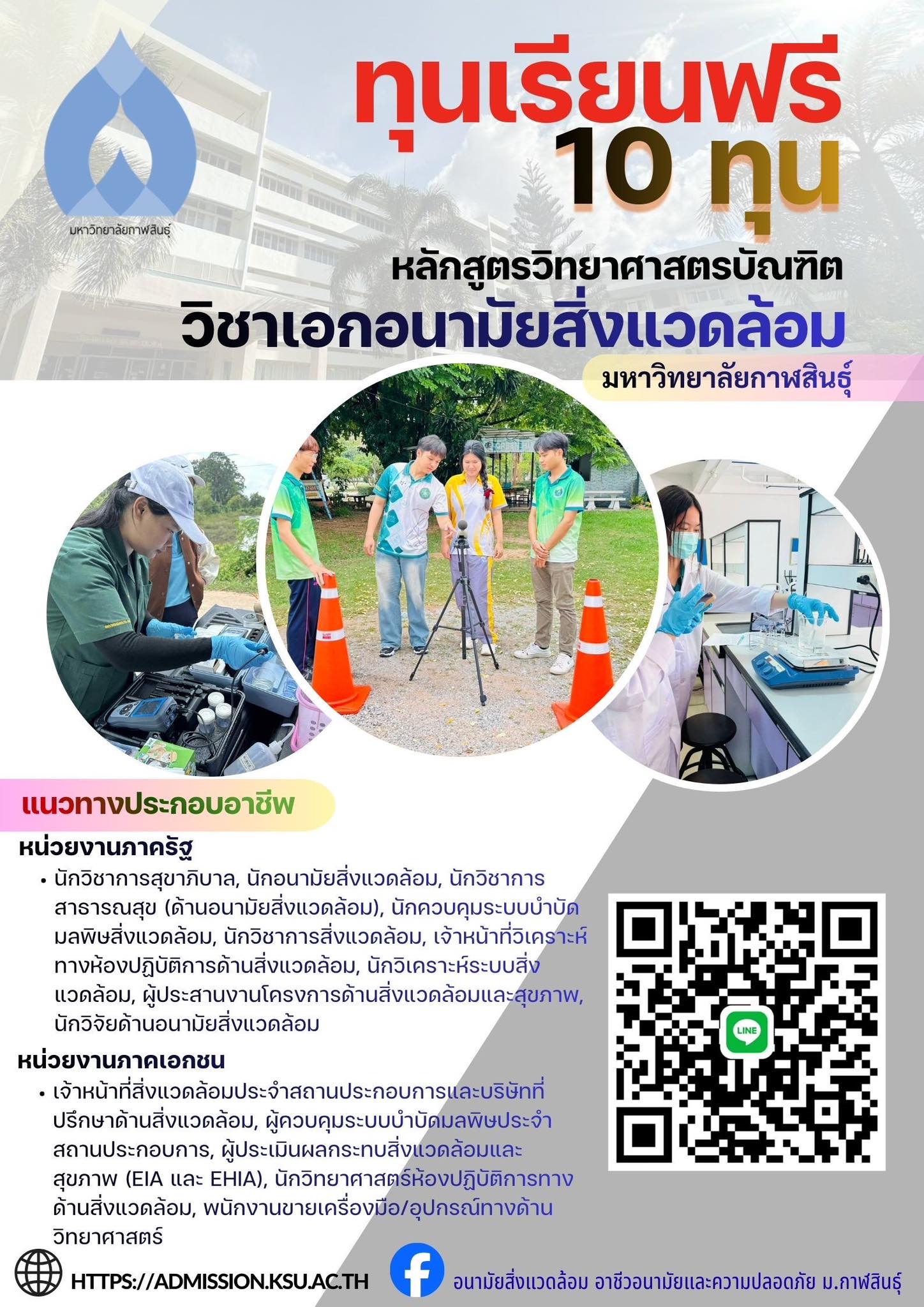สอบถามรายละเอียดเพิ่มเติมได้ที่เพจสาขาโดยตรง วิทยาศาสตร์และเทคโนโลยีสิ่งแวดล้อม มหาวิทยาลัยกาฬสินธุ์ หรือ Scan ได้เลย