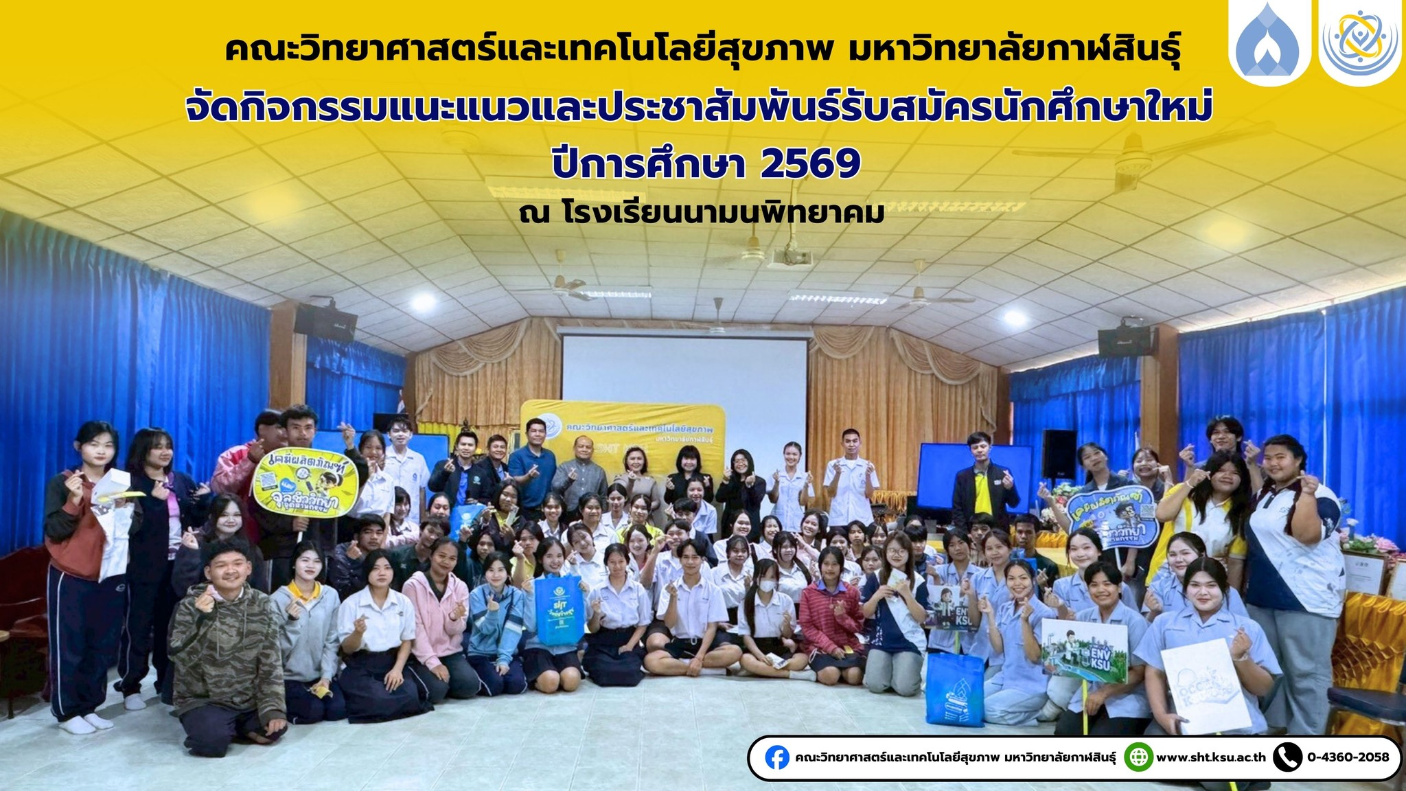 วันที่ 11 กุมภาพันธ์ 2569 คณะวิทยาศาสตร์และเทคโนโลยีสุขภาพ มหาวิทยาลัยกาฬสินธุ์ จัดกิจกรรมออกแนะแนวและประชาสัมพันธ์การรับสมัครนักศึกษาใหม่ ประจำปีการศึกษา 2569 ณ โรงเรียนนามนพิทยาคม เพื่อให้ข้อมูลการศึกษาต่อในระดับอุดมศึกษาแก่นักเรียนที่สนใจ