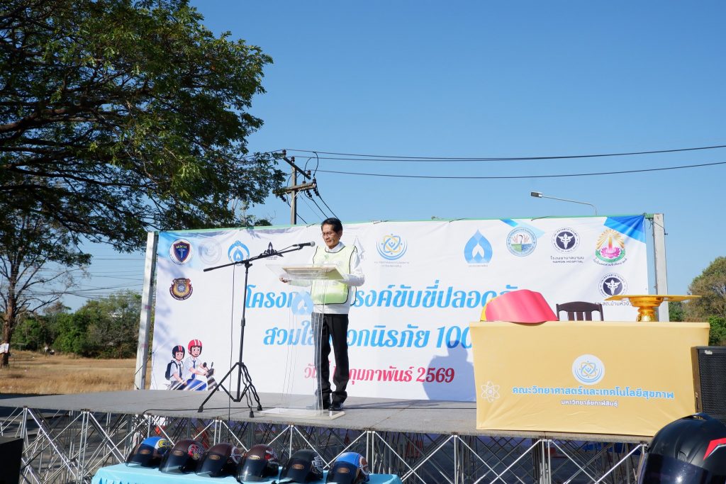 โดยได้รับเกียรติจากท่านรองศาสตราจารย์ ดร.สุพรรณ สุดสนธิ์ อธิการบดี มหาวิทยาลัยกาฬสินธุ์ Kalasin University เป็นประธานในพิธีเปิดงาน ทั้งนี้ผู้ช่วยศาสตราจารย์ ดร. ทรงกรด พิมพิศาล คณบดีคณะวิทยาศาสตร์และเทคโนโลยีสุขภาพขึ้นกล่าววัตถุประสงค์การจัดงาน พร้อมทั้งมีพิธีลงนามบันทึกความร่วมมือด้านการรณรงค์ขับขี่ปลอดภัยสวมหมวกนิรภัย ร่วมกับหน่วยงานภาคีเครือข่าย ได้แก่