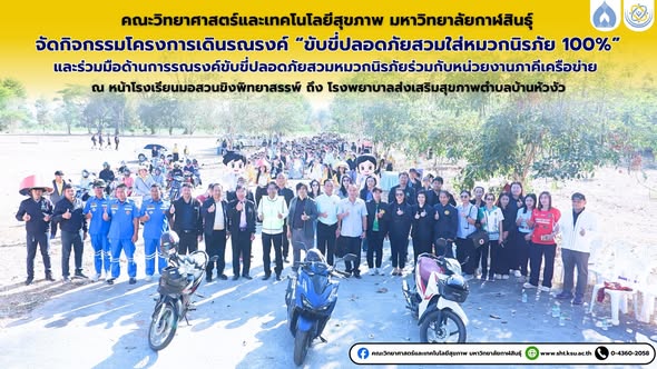 คณะวิทยาศาสตร์และเทคโนโลยีสุขภาพ มหาวิทยาลัยกาฬสินธุ์จัดโครงการเดินรณรงค์ “ขับขี่ปลอดภัย สวมหมวกนิรภัย 100%” ณ บริเวณหน้าโรงเรียนมอสวนขิงพิทยาสรรพ์ ถึงโรงพยาบาลส่งเสริมสุขภาพตำบลบ้านหัวงัว