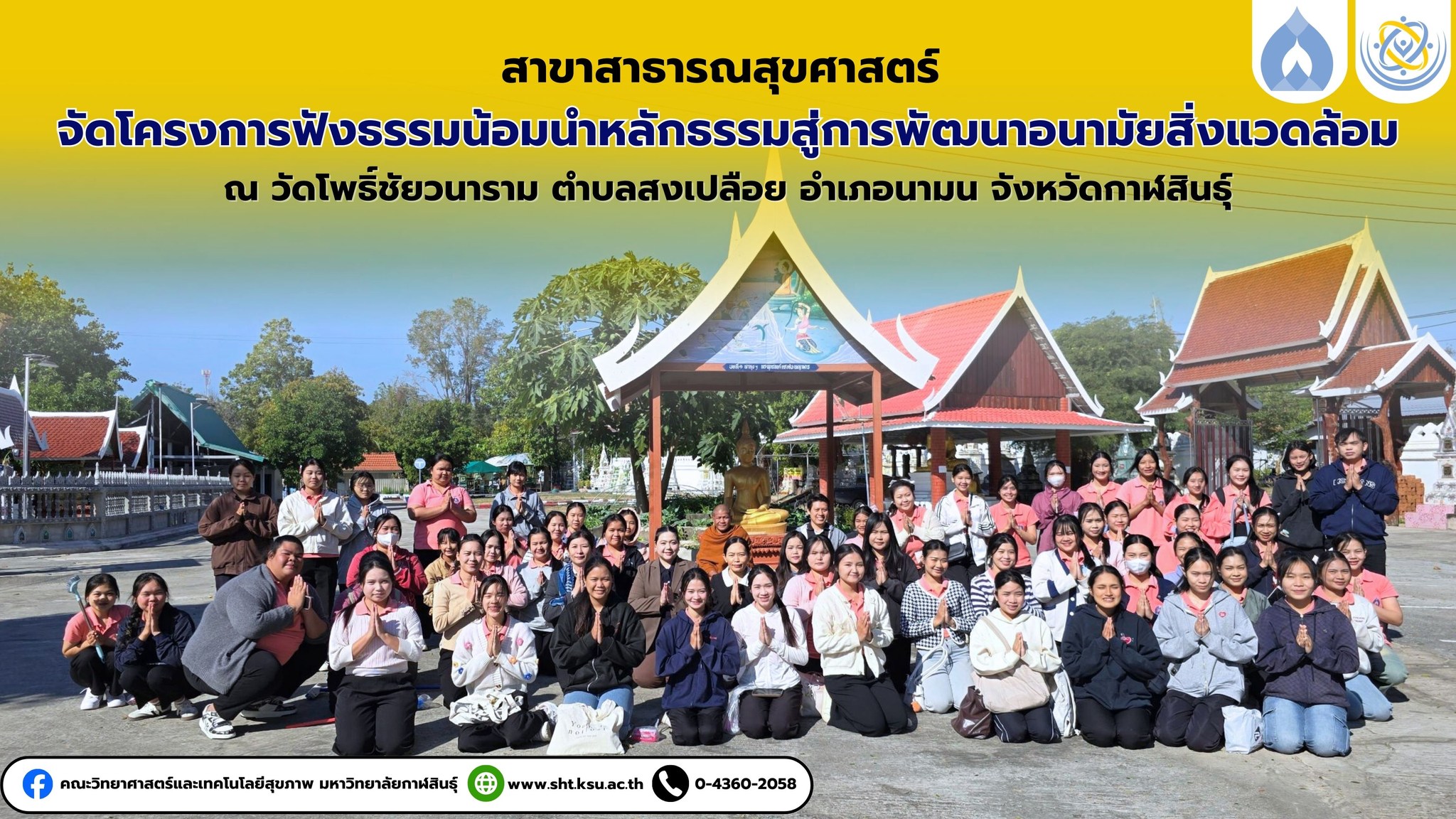 วันนี้ 8 มกราคม 2569 เวลา 08.30 น. อาจารย์และนักศึกษาสาขาวิชาสาธารณสุขศาสตร์ ได้จัดกิจกรรม โครงการฟังธรรมน้อมนำหลักธรรมสู่การพัฒนาอนามัยสิ่งแวดล้อม ณ วัดโพธิ์ชัยวนาราม ตำบลสงเปลือย อำเภอนามน จังหวัดกาฬสินธุ์